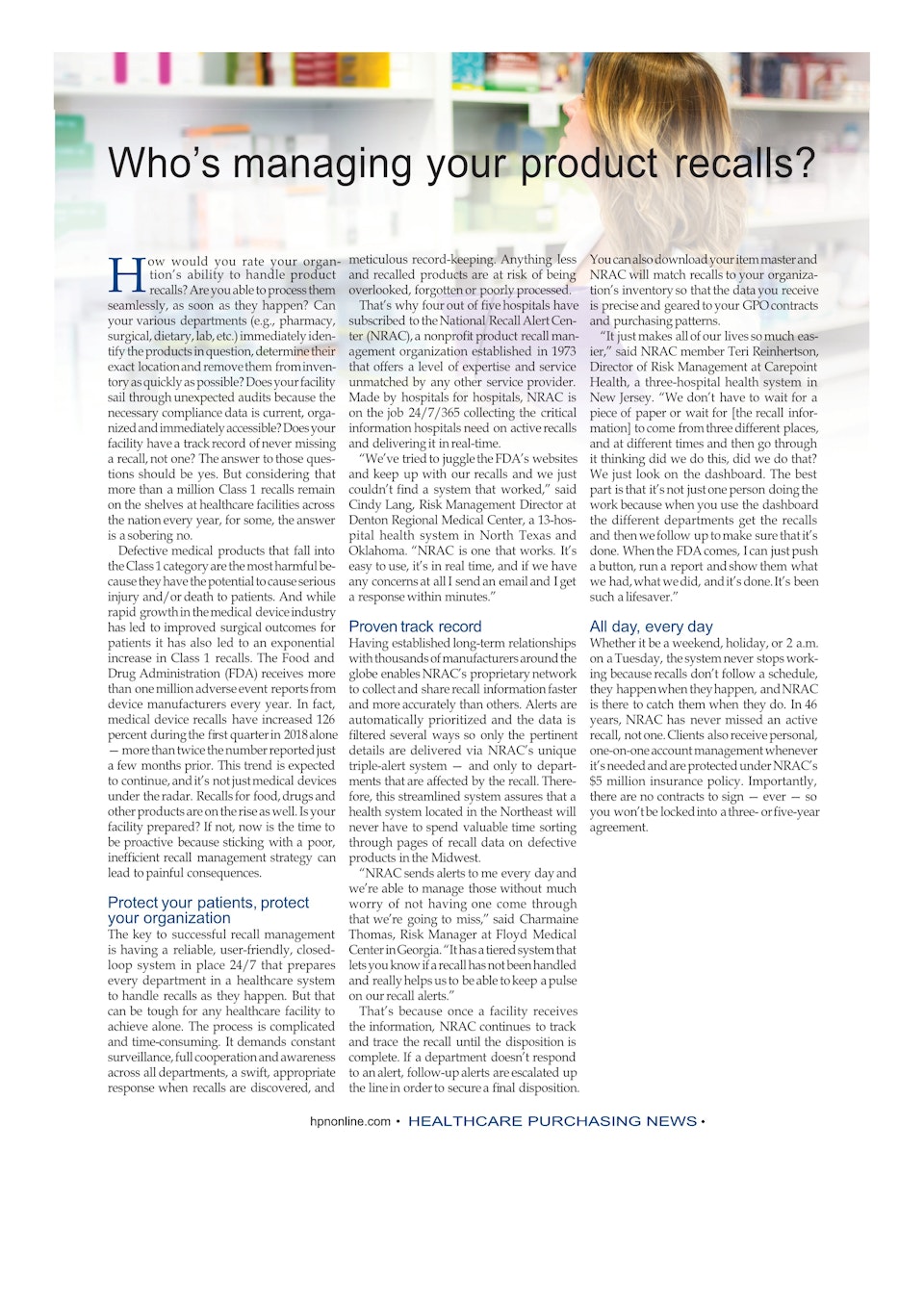 National Recall Alert Center is proud of the following two facts most of all: NRAC is the only organization that has never missed an active recall for almost one-half a century. Moreover, no facility protected by National Recall Alert Center has ever had a malpractice action due to a product recall.